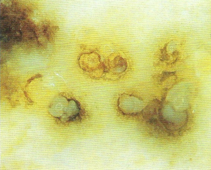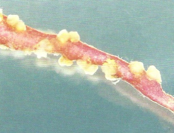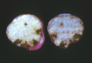 ◦ 피해를 받은 덩이뿌리를 단면으로 잘라 현미경으로 보면 가장자리에 뿌리혹선충 암컷과 주변 조직의 세포가 비대해져 있고 심한 경우 검게 썩어 있음