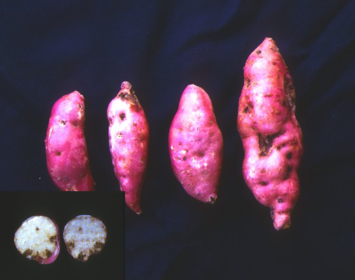 ◦ 피해를 받은 덩이뿌리는 표면에 혹이 형성되거나 부풀어 올라 기형이 되며, 세로로 쪼개져 병원균의 침입을 용이하게 함