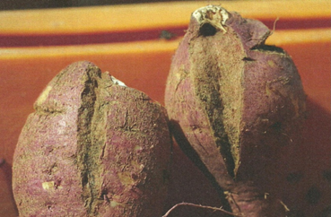 ◦ 괴근이 형성되는 기간에 저온(12~16℃)에 노출되면 발생이 증가하며, 서늘하고 건조한 토양에서 생산된 고구마는 엷은 껍질 층을 가지고 있어서 내부 조직으로부터 증가된 압력에 의해 쉽게 갈라짐