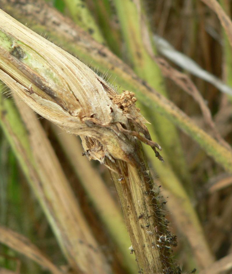 ◦ 피해가 심하면 줄기가 부러지거나 피해 부분 위쪽이 말라 죽으며, 줄기 속으로 들어가 유충은 담갈색 똥을 밖으로 배출함