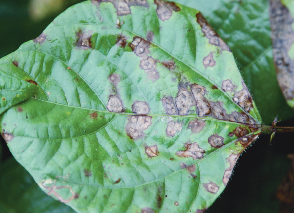 ◦ 잎의 상부에는 적자색~자갈색의 원형 병반이 형성되며, 가장 위쪽의 잎과 잎자루는 마르고 갈변함