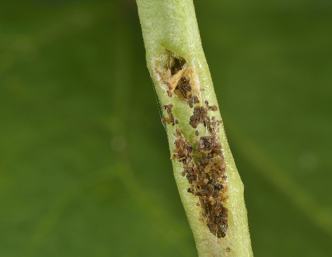 ◦ 개화기에 줄기나 엽병 표면이 황갈색으로 변색되며, 벌레 똥이 보이므로 발생을 인지할 수 있으며, 줄기 속으로 먹어 들어가서 줄기 안에 벌레똥만 가득 찬 경우도 있음