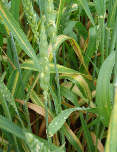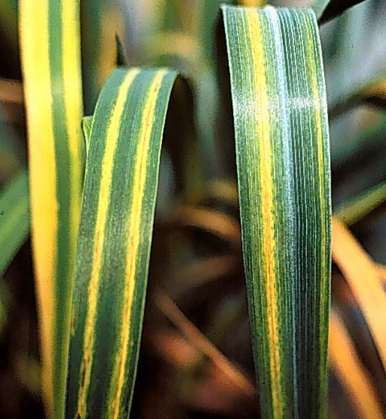 ◦ 잎, 잎집, 줄기에 노란 줄무늬가 생기고 이 노란 줄무늬 중앙으로 갈색의 얇은 줄무늬가 나타남