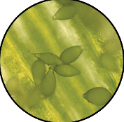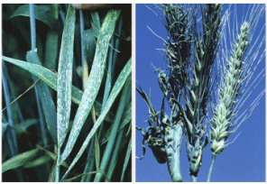 ◦ 감염 식물체의 잎은 두껍거나 가죽 같은 느낌이 있으며, 덜 심한 경우에는 줄기가 크기는 하지만 뒤틀린 이삭이 종자를 맺지 못하고 출수하게 됨
