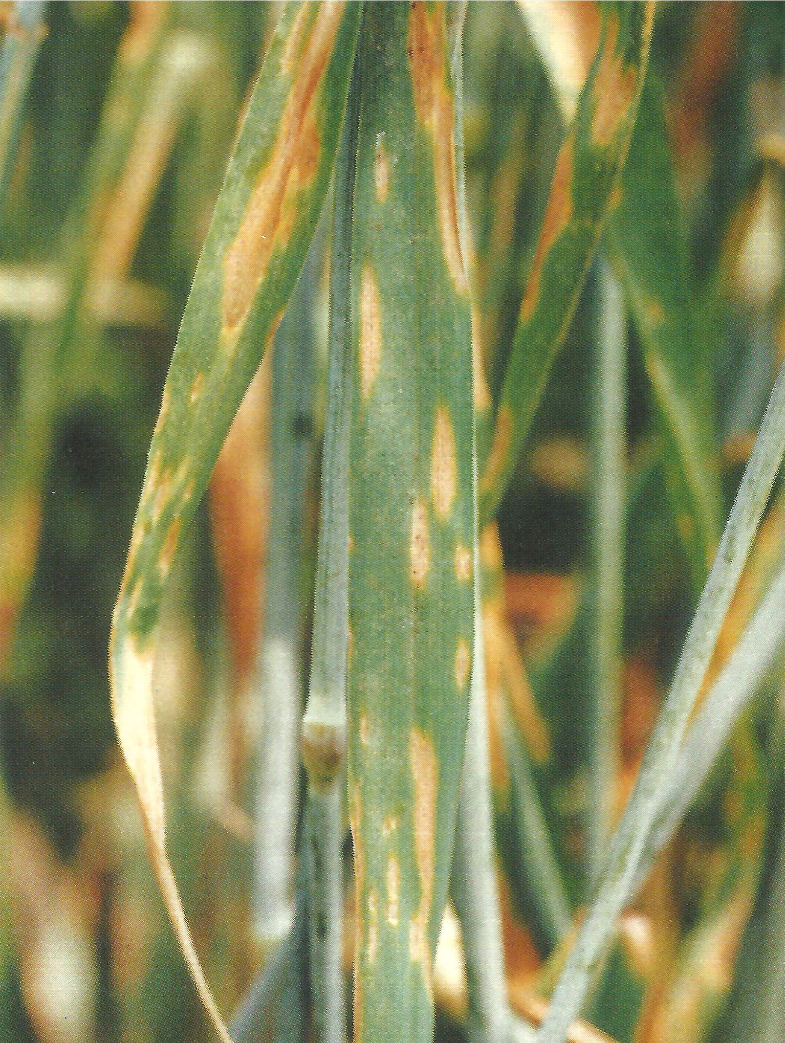 ◦ 잎에 초기에 암갈색의 작은 점무늬로 나타나고 진전되면 병반이 황갈색을 띠며, 길게 확대됨