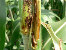 ◦ 줄기의 피해 증상은 부화한 유충이 줄기에 구멍을 내고 속을 파고 들어가 생활하면서 배설물을 밖으로 배출하기 때문에 쉽게 알 수 있으며, 특히 수수 줄기에서는 피해 부분이 빨갛게 되기 때문에 구별이 쉬움