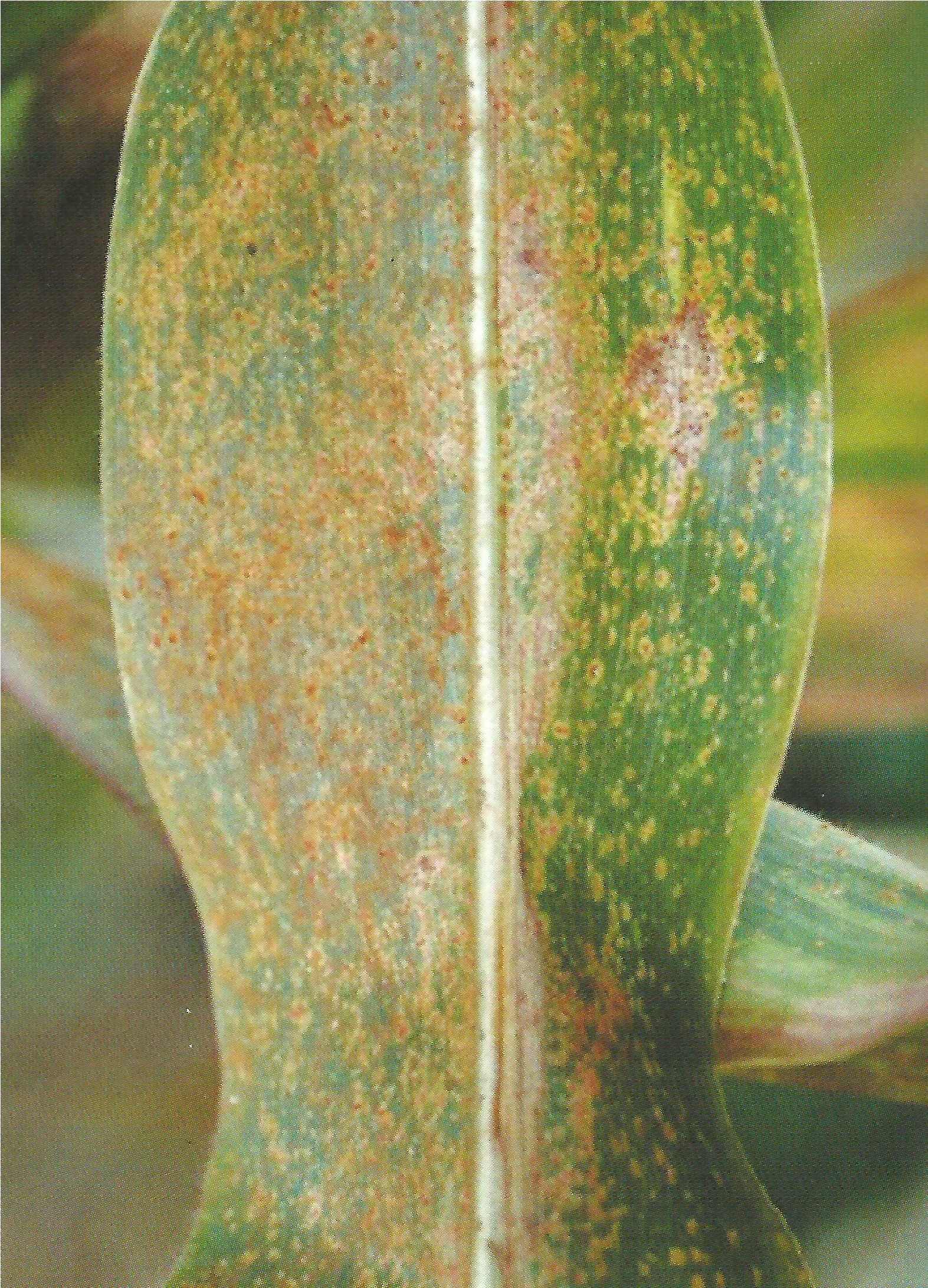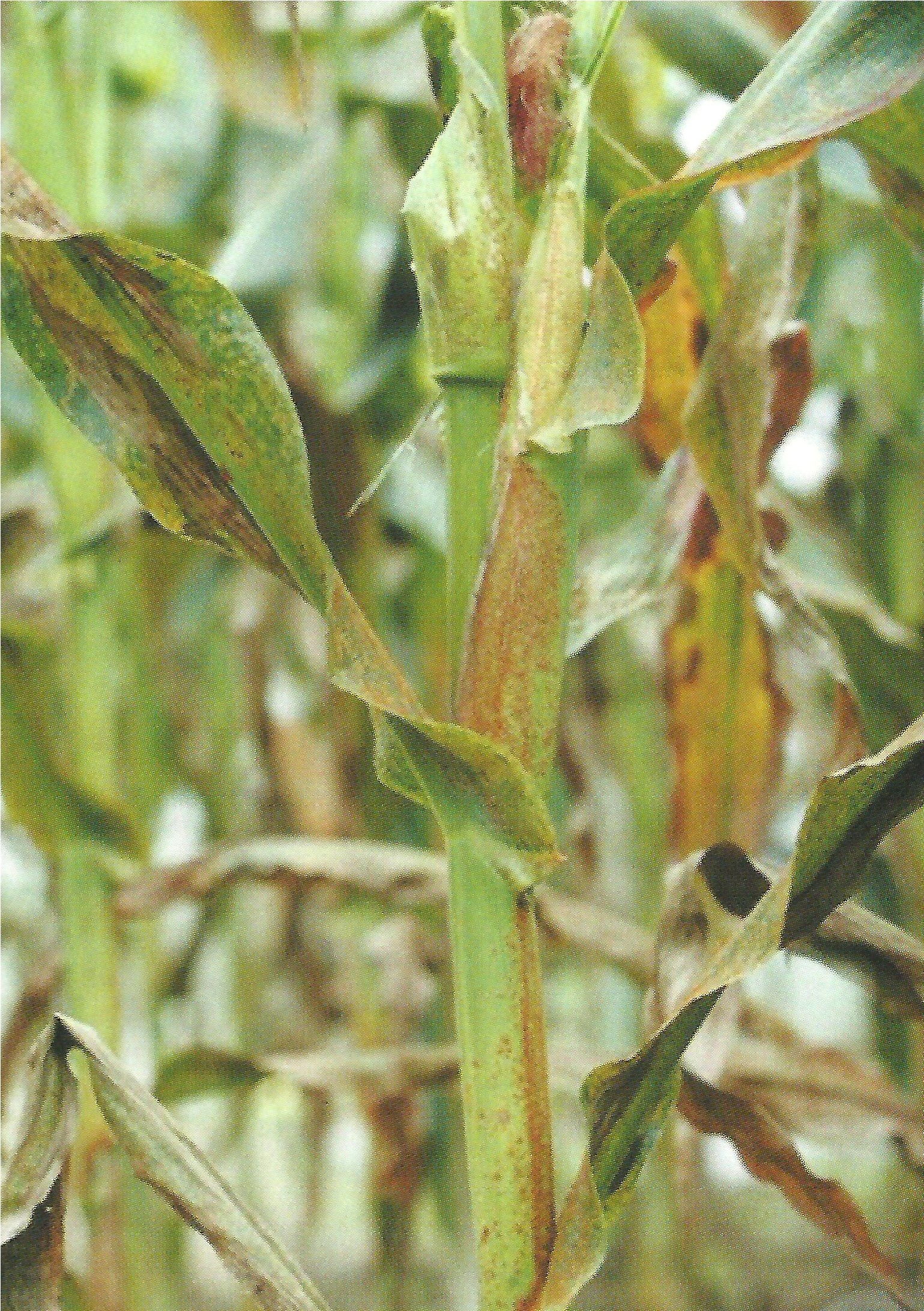 ◦ 심하게 진전되면 돌기모양의 포자퇴는 잎과 잎집에 전반적으로 흩어져 발생하고 병든 잎은 탈색되어 말라 죽음