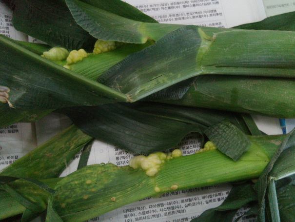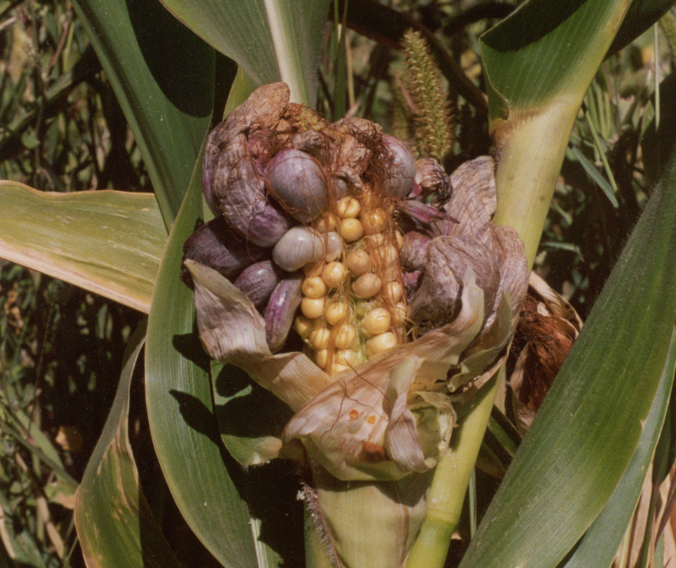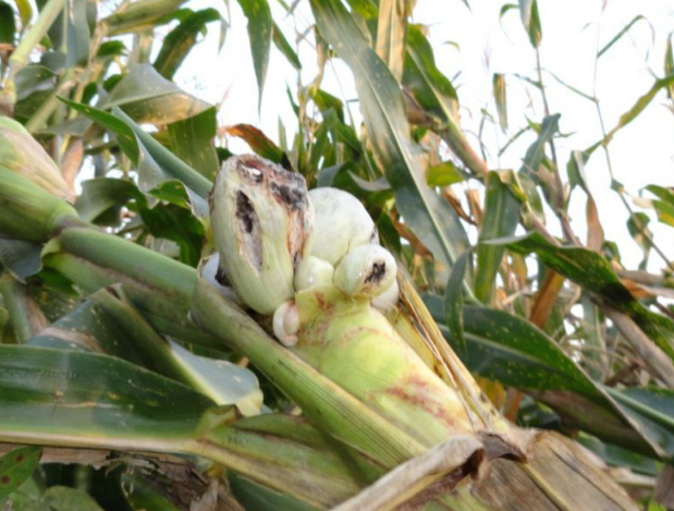 ◦ 병든 부위는 이상비대로 혹으로 변하고 초기에는 광택이 있는 하얀 막에 싸여 있으나 후에 이 막이 터지고 속에서 검은 가루모양의 후막포자가 나옴