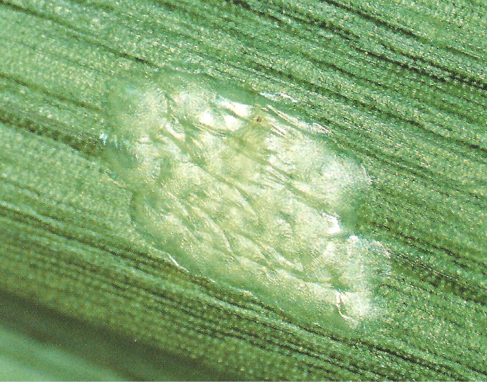 ◦ 잎 뒷면에 물고기 비늘 모양의 난괴로 총 300~1,000개를 산란하고 난 기간은 4~6일, 유충 기간은 20~30일, 번데기 기간은 6~7일, 성충의 수명은 5~12일임