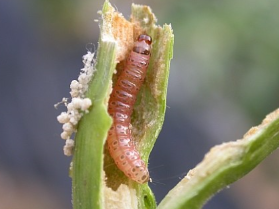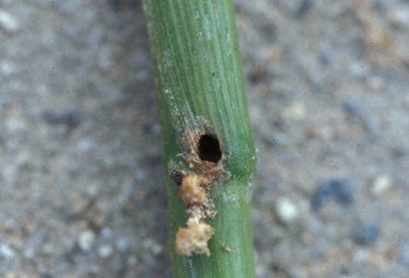 ◦ 1화기 유충은 엽초 또는 줄기 속으로 파고 들어가며, 속을 가해하므로 피해가 심하면 줄기가 부러져서 윗부분이 고사함