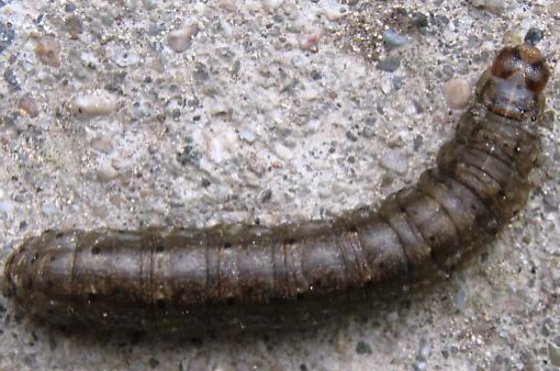 ◦ 다 자란 유충은 40~45mm 내외로 머리는 갈색, 몸은 암회갈색을 띠고 광택이 없으며, 피부 표면에 거친 과립상의 원형 무늬가 흩어져 있어 피부 과립이 세밀하고 편평해 보이는 거세미나방과 구별됨