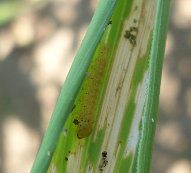 ◦ 유충이 잎을 철하여 그 속에서 가해하며, 피해를 받은 잎은 표피만 남고 백색으로 변함