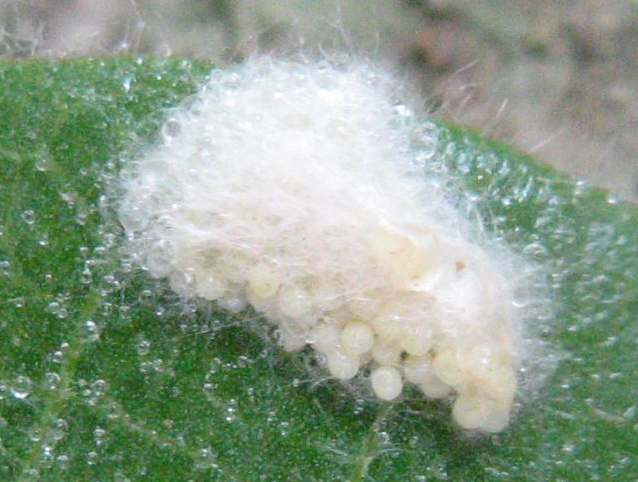 ◦ 성충 발생 최성기는 5월 상순, 6월 중·하순, 7월 하순, 8월 하순, 9월 하순으로 우화 후 2~5일 동안 1,000~2,000개의 알을 100~300개의 난괴로 잎 뒷면에 산란함