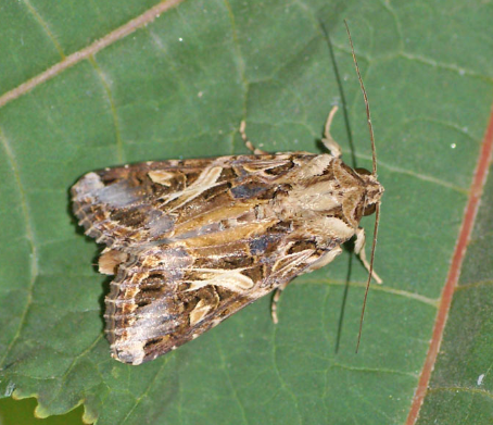 ◦ 성충의 앞날개는 갈색 또는 회갈색으로 매우 복잡한 무늬가 있고 뒷날개는 회백색이고 투명하며, 가장자리는 회색이고 종종 시맥이 짙은 색을 띠고 몸길이는 15~20mm, 날개편길이는 30~38mm임