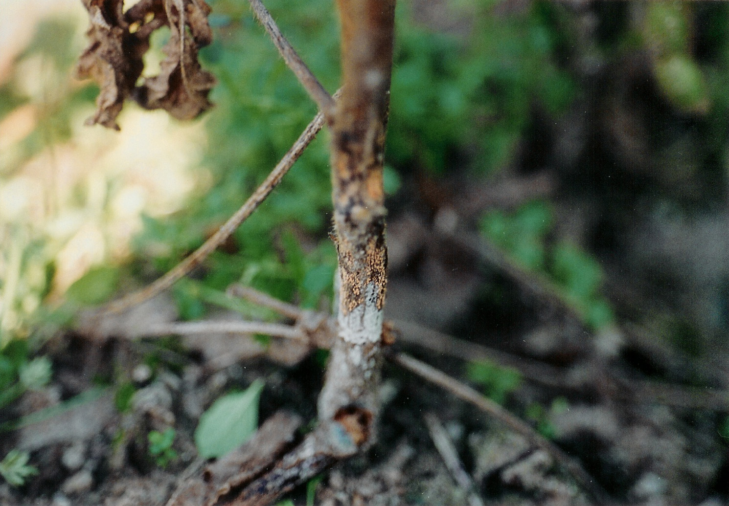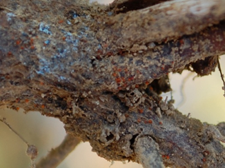 ◦ 부패한 지하부 줄기 주근에는 오렌지색 또는 붉은색의 소립점(자낭각)이 형성되고 또한 백색의 균총이 형성되어 뿌리를 덮어 흰 모양으로 나타나며, 여기에는 분생포자가 다수 형성됨