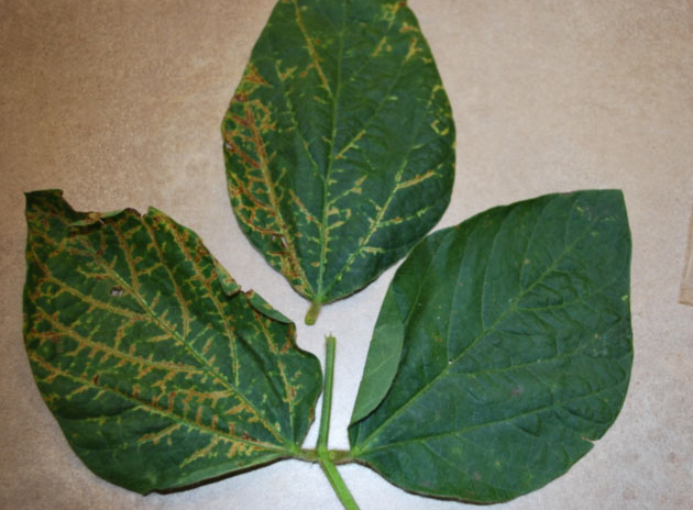 ◦ 초기에 잎의 주엽맥 근처가 황백화되기 시작하여 갈색으로 괴사되어 확대됨
