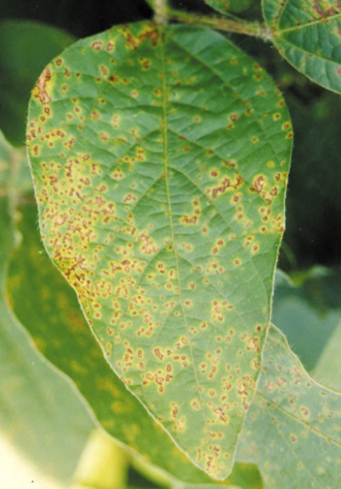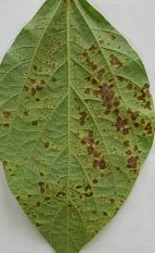 ◦ 주로 잎에 발생되나 꼬투리, 줄기에서도 작은 적갈색의 볼록한 병반이 형성되며 병반들이 합쳐져서 조그만 줄무늬나 크고 불규칙한 병반이 형성되기도 함