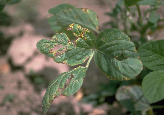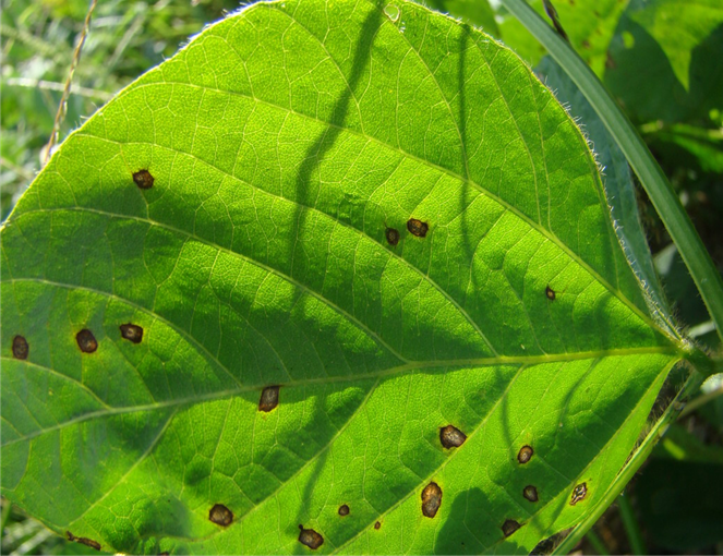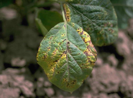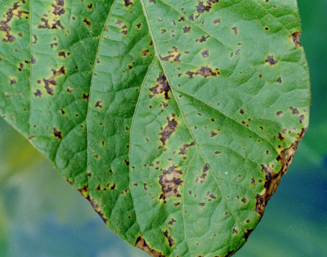 ◦ 주로 잎에 발생하지만 자엽, 잎자루, 줄기, 꼬투리에도 병반 형성
