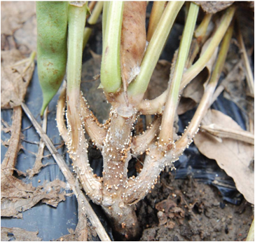 줄기 부위가 수침상으로 석고 흰색의 곰팡이가 솜털모양으로 생기며, 갈색의 작은 둥근 균핵을 형성함