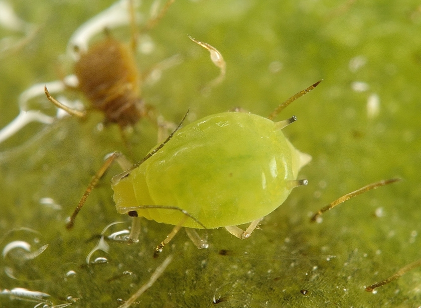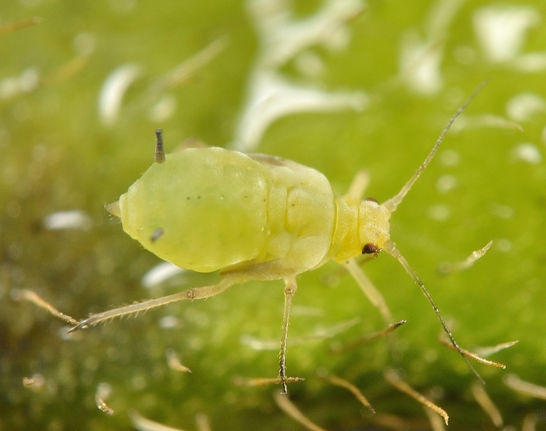 ◦ 무시충은 유시충처럼 황색이고 촉각은 끝부분이 거무스름하고 몸길이의 절반을 약간 넘으며, 뿔관은 원통형으로 검은색을 띠지만 때로는 밑부분이 연하며, 배에 희미한 그물 무늬가 있음