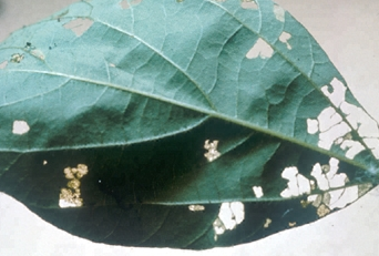 ◦ 어린 유충이 잎 위에서 가해하여 둥근 구멍이 생김