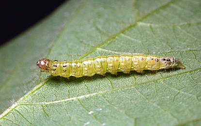 ◦ 유충은 15~17mm이며, 머리는 황갈색이고 몸통은 녹색이며, 경피판은 녹색이고 옆쪽에 1개씩 검은 점이 뚜렷함
