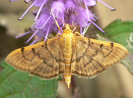 ◦ 몸노랑들명나방과 비슷하나 몸노랑들명나방이 약간 더 크고 앞뒷날개 모두 연한 황색이며 검은 선도 뚜렷함