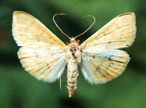 ◦ 부화유충은 잎의 뒷면에서 가해하고 성장하면 2~3개의 잎을 세로로 말고 그 속에서 가해하며, 약 20일 정도 지나서 번데기가 되는데 기간은 6~9일임