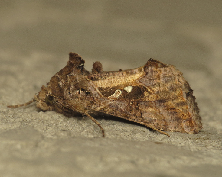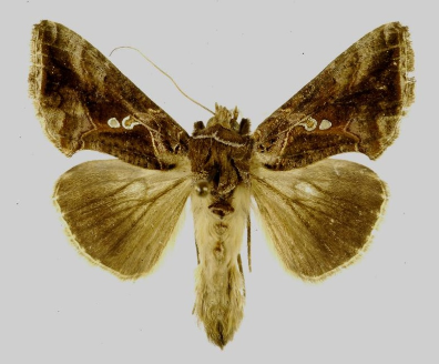 ◦ 성충의 몸길이는 18~19mm 정도에 날개편 길이는 28~29mm정도로 앞날개는 흑갈색이고 금빛 광택이 나며, 은백색의 반점이 2개 있음