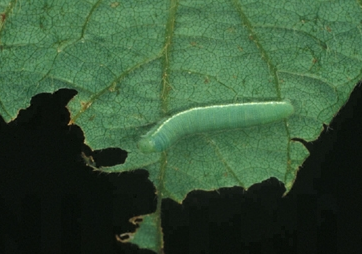 ◦ 유충은 원통 모양이고 머리가 몸통보다 폭이 좁으며, 전체적으로 녹색을 띠고 배추흰나비의 유충과 비슷하나 측면에 황색의 기문선이 있음