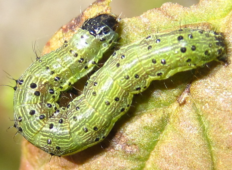 ◦ 유충은 연한 녹색부터 짙은 갈색까지 체색변이가 다양하고 자모 밑 부분에 혹 모양으로 돌출한 검은 밑판이 뚜렷하여 검은 점으로 보임