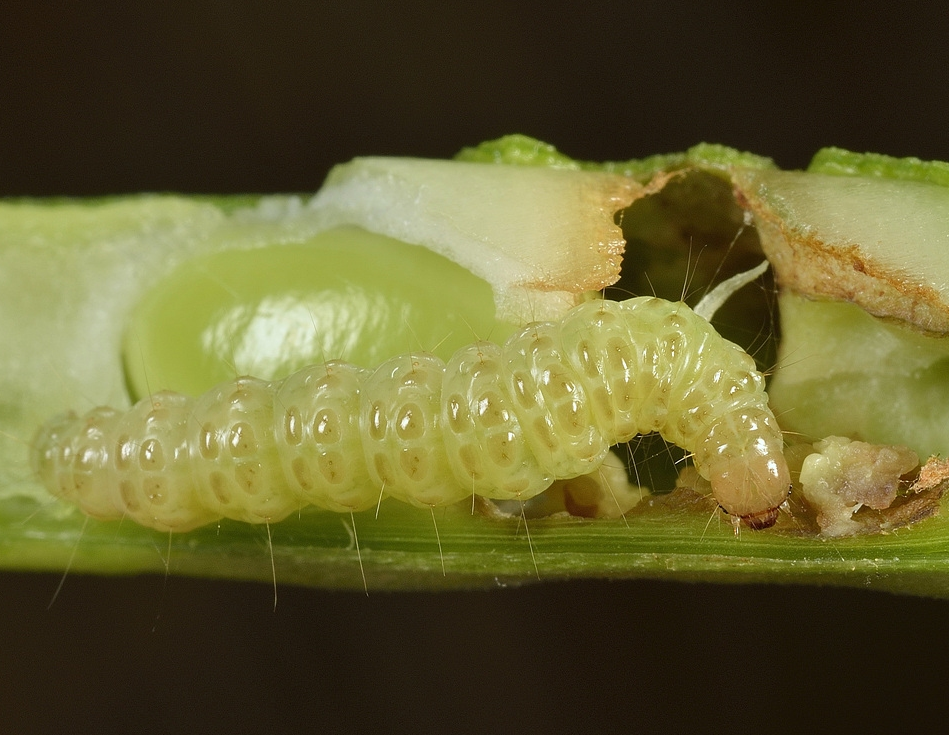 ◦ 개화기에 줄기나 엽병 표면이 황갈색으로 변색되며, 벌레 똥이 보이므로 발생을 인지할 수 있으며, 줄기 속으로 먹어 들어가서 줄기 안에 벌레똥만 가득 찬 경우도 있음