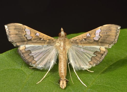 ◦ 앞날개는 진한 황갈색 바탕에 흑색 인편으로 덮여 있고 중앙에 백색의 큰 띠가 하나 있으며, 기부쪽으로 백색 무늬가 두 개 더 있음