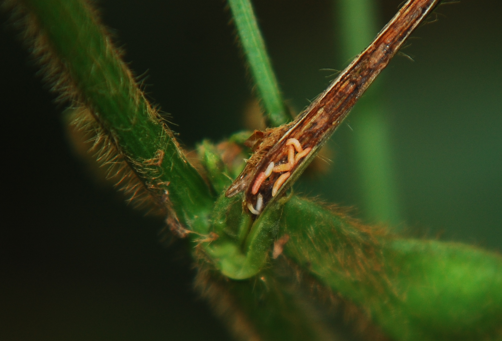 ◦ 잎자루 부위에서 잎이 떨어지고 그 자리가 갈변되기도 하며, 피해 받은 줄기를 절개할 경우 내부에 다수의 유충이 발겸됨