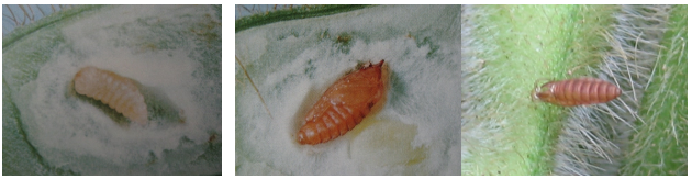◦ 꽃이나 어린 꼬투리 속에 산란된 알은 부화하여 꼬투리 안에서 콩 립을 먹고 20일 정도 발육하여 번데기가 되고 성충으로 우화하는데 탈출하면서 번데기 껍질을 꼬투리 표면에 남김