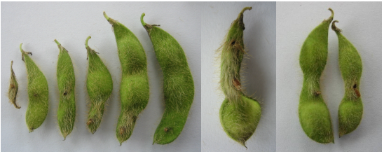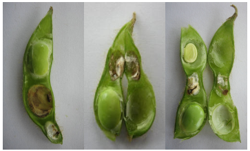 ◦ 피해양상은 산란시기에 따라 약간 다르지만 기본적인 피해증상은 꼬투리가 정상적으로 발육하지 못하여 피해 부위가 잘록하게 되고 뒤틀려져 콩 립의 정상적인 발육이 저해됨