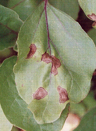 ◦ 잎에서는 처음 갈색의 작은 점무늬로 나타나고 진전되면 암갈색의 부정형 겹무늬 병반으로 확대되며, 후에 병반들이 서로 융합하여 커지고 잎이 마름