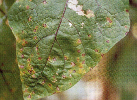 ◦ 오래된 병반 중앙부에는 암회색의 분생포자가 형성되고 심하면 중앙부의 조직이 파열되어 구멍이 뚫리기도 하며, 심하게 진전되면 잎 전체가 마르고 떨어짐