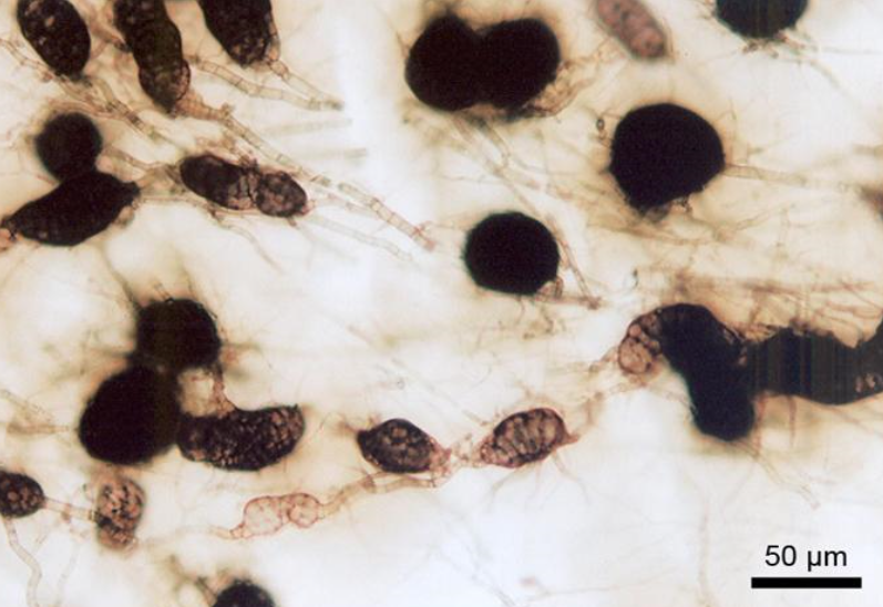 ◦ 감염부위에는 많은 병자각이 형성되어 검은 소립점으로 보임