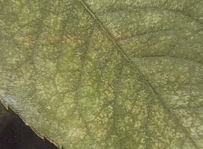 ◦ 잎 뒷면에서 세포 내용물을 빨아 먹어 잎 표면에 작은 흰 반점이 무더기로 나타나고 진전되면 잎이 갈색으로 변하면서 말라죽고 조기 낙엽됨