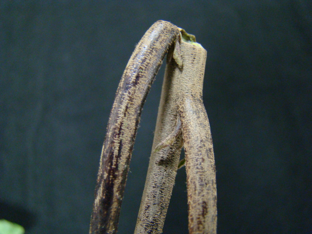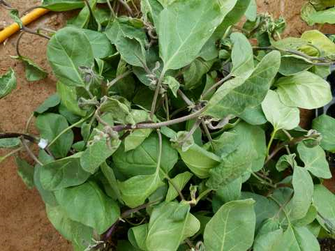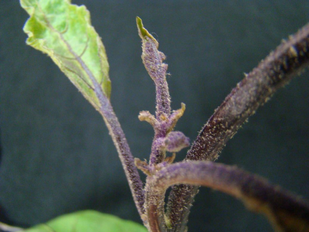 ◦ 초기에는 생장점 부위의 어린잎에 주름이 생기고 잎 가장자리가 안쪽으로 오그라들고 기형이 되며, 이때 잎 뒷면은 마치 기름을 바른 것처럼 광택이 나고 갈색이 짙어지며, 심하면 생장점 부근의 잎이 말라 떨어짐