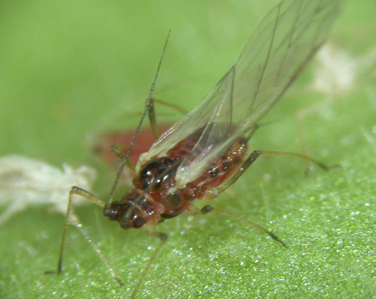 ◦ 무시충은 난형인데 담녹색 내지 담황녹색인 것과 담홍색인 것의 두 가지 유형이 있고 기온이 낮은 시기에 담홍색 개체가 많이 발생하며, 뿔관은 흑색이고 중앙부가 약간 팽대되어 있음