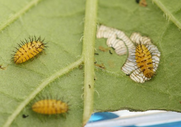 ◦ 다자란 유충은 약 9mm 정도의 방추형으로 담황색을 띠며, 앞가슴에는 말굽형 무늬가 있고 가슴과 배의 등쪽에는 나뭇가지 모양의 검정 돌기가 몸마디마다 6개씩 나 있으며, 각 돌기의 끝은 여러 갈래의 작은 가시로 나뉘어져 있음
