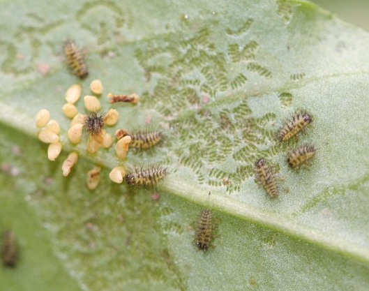 ◦ 1회 성충은 6월 하순~7월, 2회 성충은 7월 하순~8월 상순, 3회 성충은 9월 상·중순에 출현하며, 알은 잎 뒷면에 난괴로 하루에 20~30개씩 총 450개를 산란함