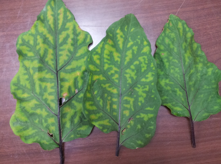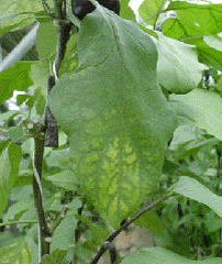 ◦ 가지 재배 중 가장 흔히 나타나는 생리장해로 아랫잎부터 잎맥의 엽록소가 줄어들어 누렇게 변하며, 하부에서 상부로 차츰 증상이 이동함