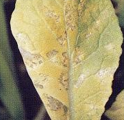 ◦ 유묘기에 발생하면 잎은 쉽게 떨어지고 묘 전체가 죽으며, 생육 후기에 감염된 잎은 떨어지지 않고 작은 병반들이 합쳐져 잎 전체가 황록색 혹은 황갈색으로 변하고 말라 죽음