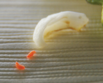 ◦ 유충의 몸길이는 1mm 정도이며, 유백색 또는 선홍색의 방추형 모양임