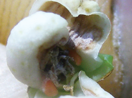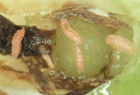 ◦ 성충이 꽃봉오리 내부에 산란하여 부화한 유충이 꽃의 내부기관을 식해하므로 피해 받은 꽃봉오리는 기형화되고 내부가 부패되어 갈변되면서 떨어짐