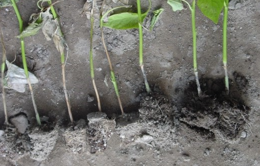 ◦ Pythium은 주로 고온다습한 조건에서 많이 발생하고 병든 부위가 수침상을 나타내는 경우가 많으며, Rhizoctonia 역시 과습할 때 발생이 많지만 병든 부위가 수침상을 잘 나타내지 않고 약간 건조한 느낌으로 마르면서 잘록해짐