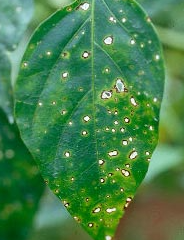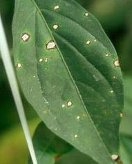 ◦ 처음에 잎에 작은 갈색점이 찍혀 직경 1~2mm정도로 확대되면서 중심부는 오목해지고 흰색으로 됨